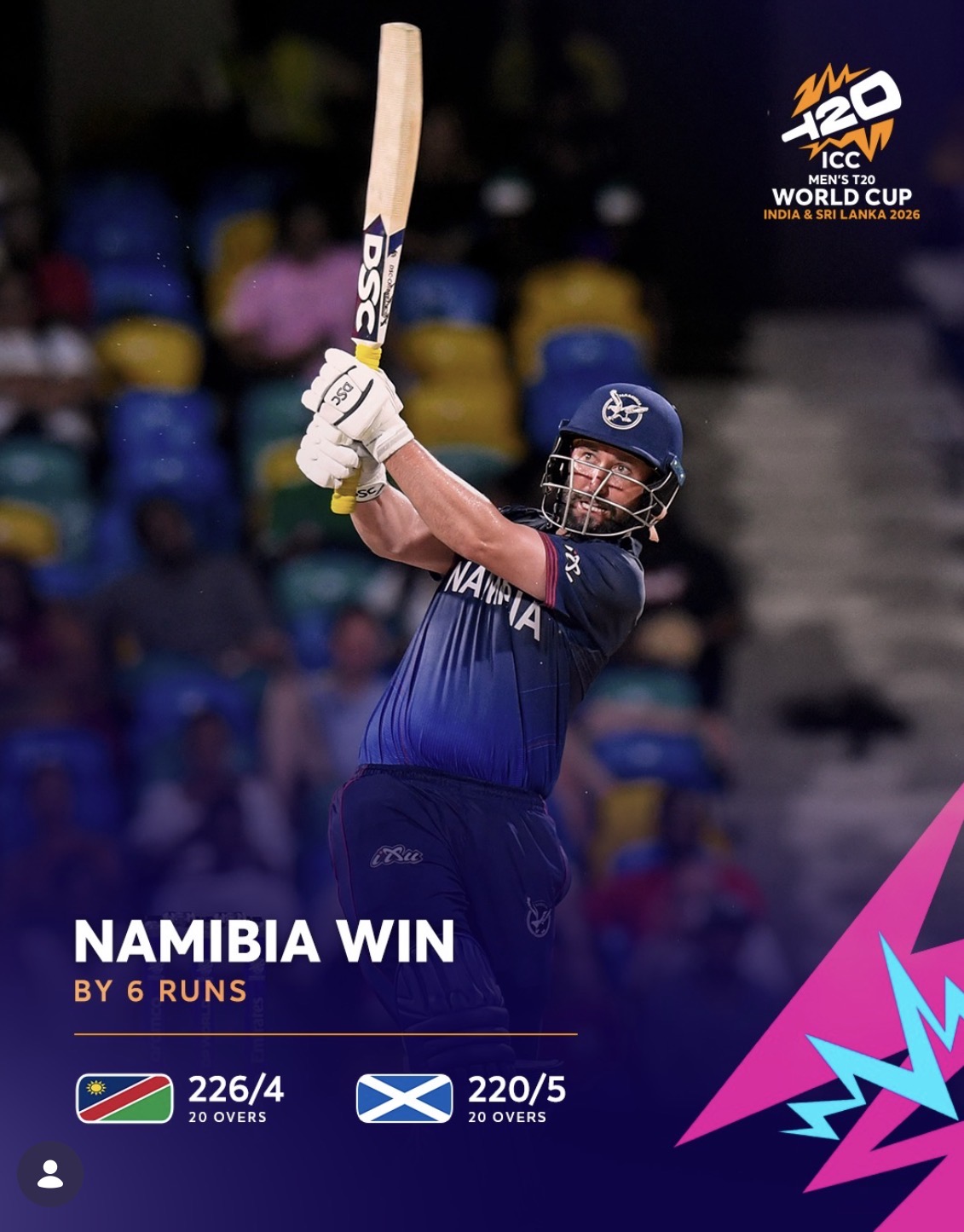 बेंगलुरुमाभएको खेलमा अर्को खेलमा नामिबियाले स्कटल्यान्डलाई छ रनले हराएयो । नामिबियाले सुरुमा चार विकेट गुमाएर २ सय २६ रन बनाएपछि जवाफमा स्कटल्यान्ड पाँच विकेटमा २ सय २० रन बनाएर समेटियो ।