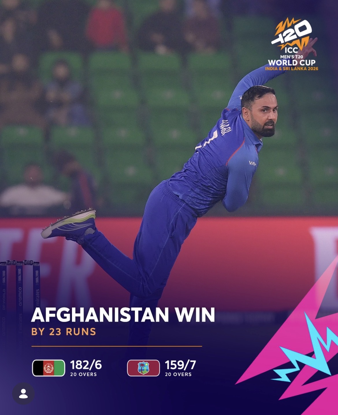 अफगानिस्तानले बेंगलुरुमै वेस्ट इन्डिजमाथि २३ रनले जित दर्ता गरेको हो । अफगानिस्तानले छ विकेटमा १ सय ८२ रन बनाएपछि जवाफमा वेस्ट इन्डिजले ५९ रन मात्र बनाउन सक्यो ।