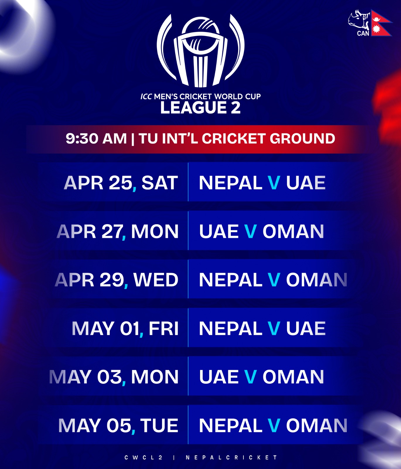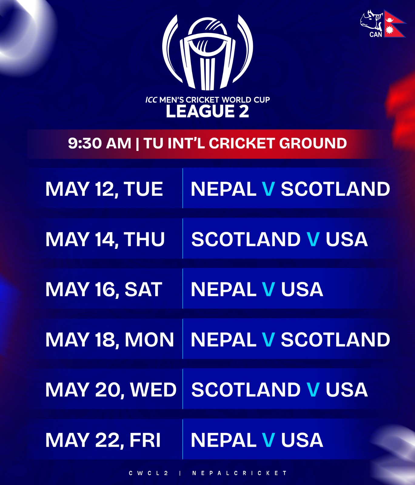 काठमाडौं। अन्तर्राष्ट्रिय क्रिकेट परिषद् ९आईसीसी० अन्तर्गतको एकदिवसीय विश्वकप क्रिकेट लिग–२ का खेलहरू आगामी वैशाख १२ देखि २२ गतेसम्म काठमाडौंमा सञ्चालन हुने भएका छन्।
