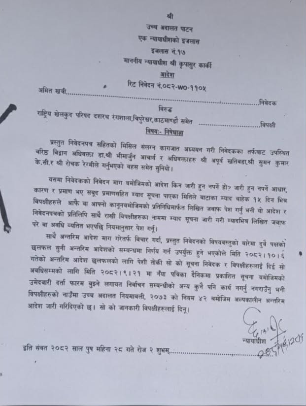 गोर्खाका अमित खत्रीले हालेको मुद्धामा सुनुवाइ गर्ने त्रममा अदालतले एन्फाको नाममा निर्वाचनका सबै प्रक्रिया रोक्न आदेश दिएको हो । अदालतले दुवै पक्षलाई माघ ६ छलफलका लागि बोलाएको पनि छ ।