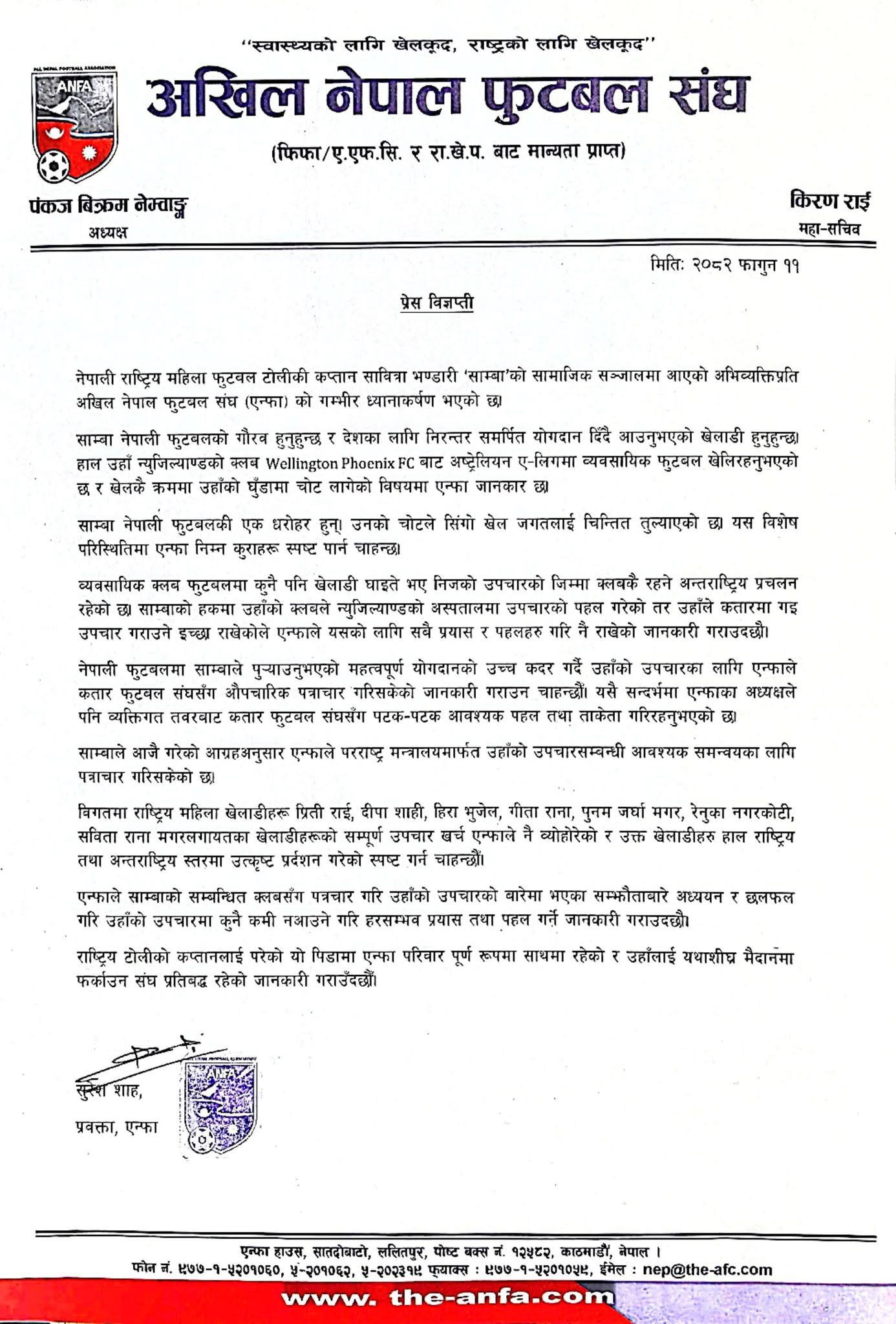संघले जारी गरेको प्रेस विज्ञप्तिअनुसार खेलका क्रममा घुँडामा चोट लागेपछि हाल अस्ट्रेलियाको व्यावसायिक क्लब वेलेङ्टन फिनिक्स एफसीबाट खेलिरहेकी भण्डारीको उपचार प्रक्रियालाई सहज बनाउन पहल गरिएको हो। व्यावसायिक खेलमा खेलाडी घाइते भएमा सम्बन्धित क्लबले उपचारको जिम्मेवारी लिने अन्तर्राष्ट्रिय प्रचलन रहे पनि संघले आवश्यक समन्वयका लागि निरन्तर पहल गरिरहेको जनाएको छ।