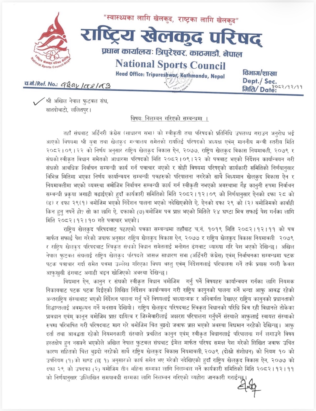 पत्रमा उल्लेख भएअनुसार एन्फाले साधारण सभा (अडिटरी कङ्ग्रेस) र निर्वाचनसम्बन्धी प्रक्रिया परिषद्को स्वीकृतिबिना अघि बढाउन खोजेको देखिएको छ। उक्त कार्य प्रचलित कानुनविपरीत रहेको ठहर गर्दै राखेपले तीन महिनासम्मका लागि निलम्बन गर्ने निर्णय गरेको हो।