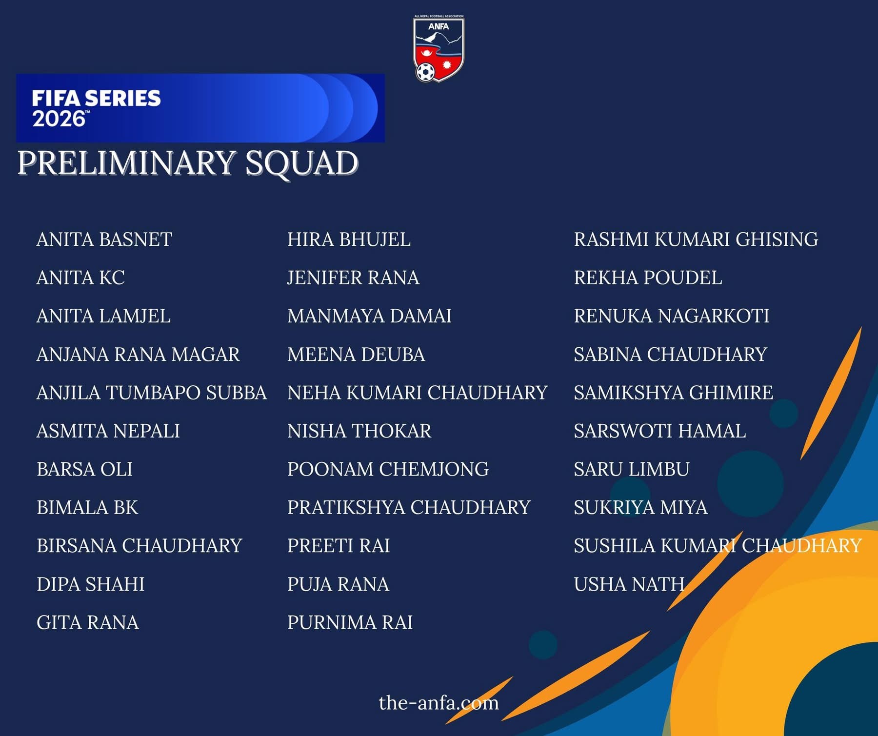 यस्तै हिरा भुजेल, जेनिफर राना, मनमाया दमाई, मीना देउवा, नेहा कुमारी चौधरी, निशा ठोकर, पूनम चेम्जोङ, प्रतिक्षा चौधरी, प्रीति राई, पूजा राना र पूर्णिमा राई पनि प्रारम्भिक सूचीमा परेका छन्।