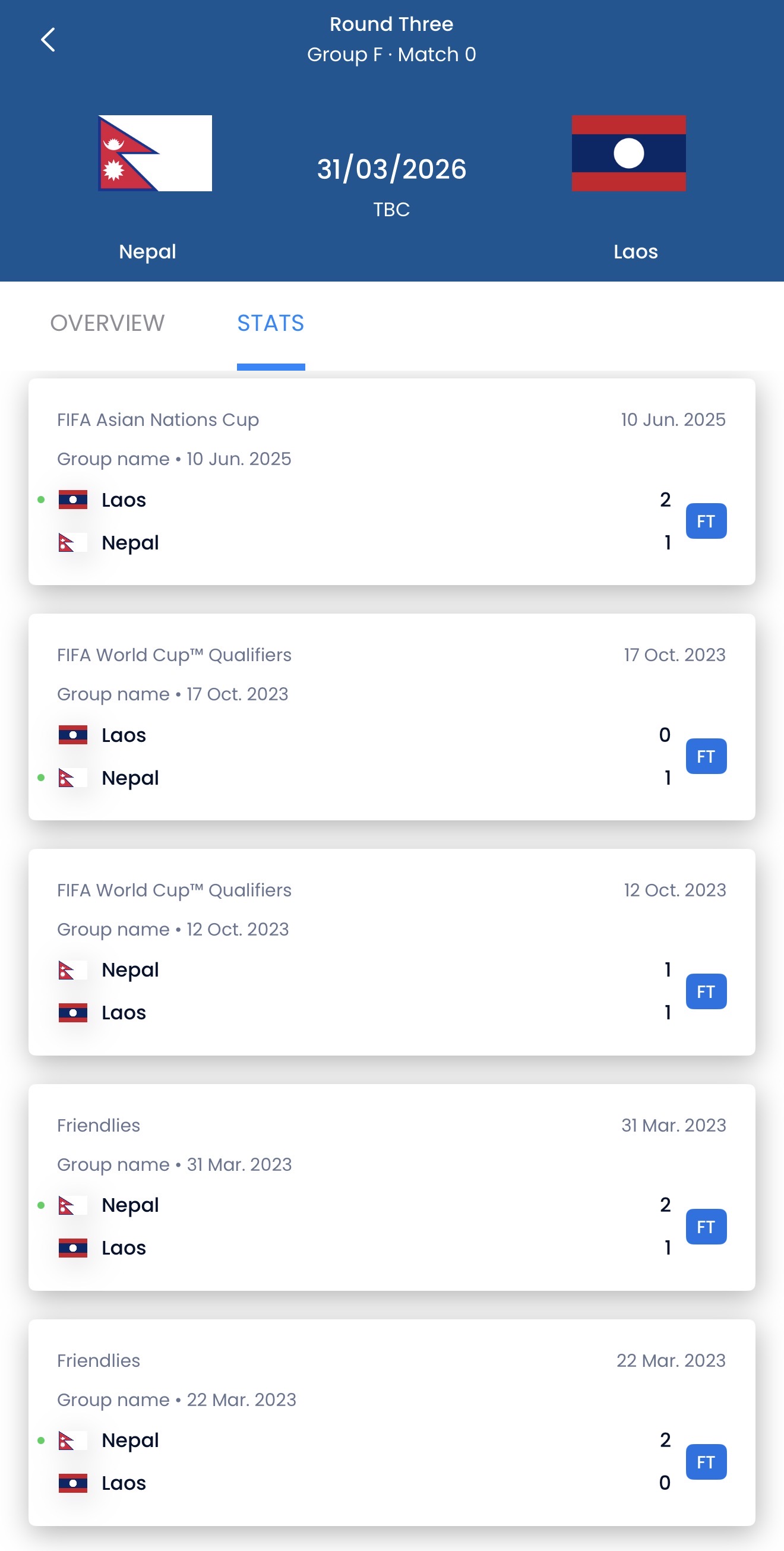 हालसम्म नेपाल र लाओसबीच ६ खेल भएका छन्। जसमा नेपालले ४ खेल जित्दा लाओसले १ खेल जितेको छ भने १ खेल बराबरीमा सकिएको छ। एएफसी कप छनोट अन्तर्गत गत वर्ष भएको पछिल्लो भेटमा नेपाल २–१ ले पराजित भएको थियो।
