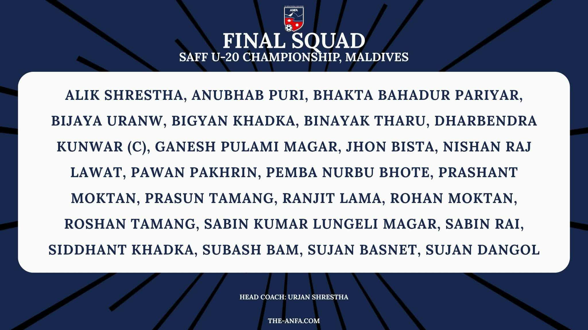 मंगलबार मुख्य प्रशिक्षक उर्जन श्रेष्ठले मार्च २३ देखि अप्रिल ४ सम्म हुने प्रतियोगिताको लागि धर्मेन्द्र कुँवरको कप्तानीमा २३ सदस्यीय अन्तिम टोली घोषणा गरेको हो।